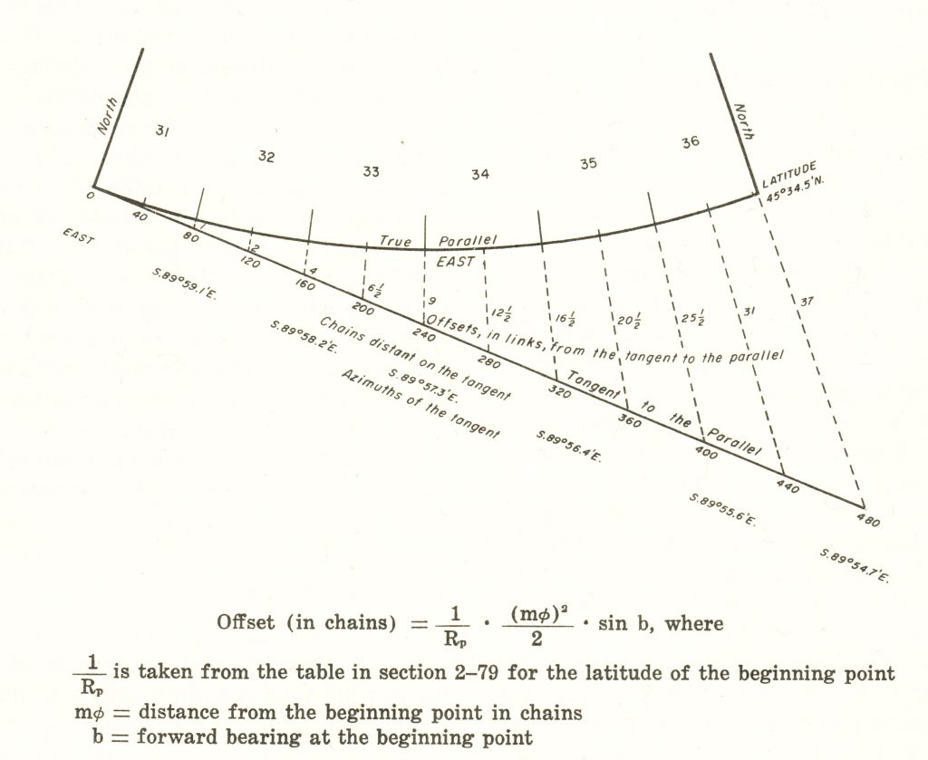 The reason this is covered in the “Manual of Surveying Instructions” is because, when the Public Land Survey System was created, surveyors often needed to survey a parallel of latitude (the Illinois-Wisconsin boundary is an example) in less-than-ideal conditions. The so-called “tangent method” to determine a true latitude line (i.e., a parallel) is based on the projection of the easterly line from the initial point of tangency. A correction factor is then used to shift locations from the resulting great circle arc back to the parallel. Details, however, are given in chains (rather than feet or meters) and the correction factor is not explained in detail. Figures 2 and 3 are taken from the 1973 edition of the manual.