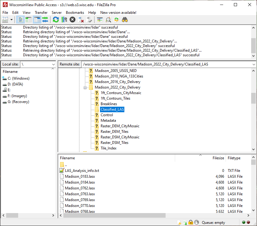All of the imagery and lidar data available through GeoData@Wisconsin are held in what is called an S3 “bucket.” If you know where to look, you can connect directly to the WisconsinView Data Archive S3 bucket and skip the web interface. This can come in handy when you need to download many hundreds of files, which is common when working with tiled lidar data. We refer to this process as “bulk downloading” from the archive.