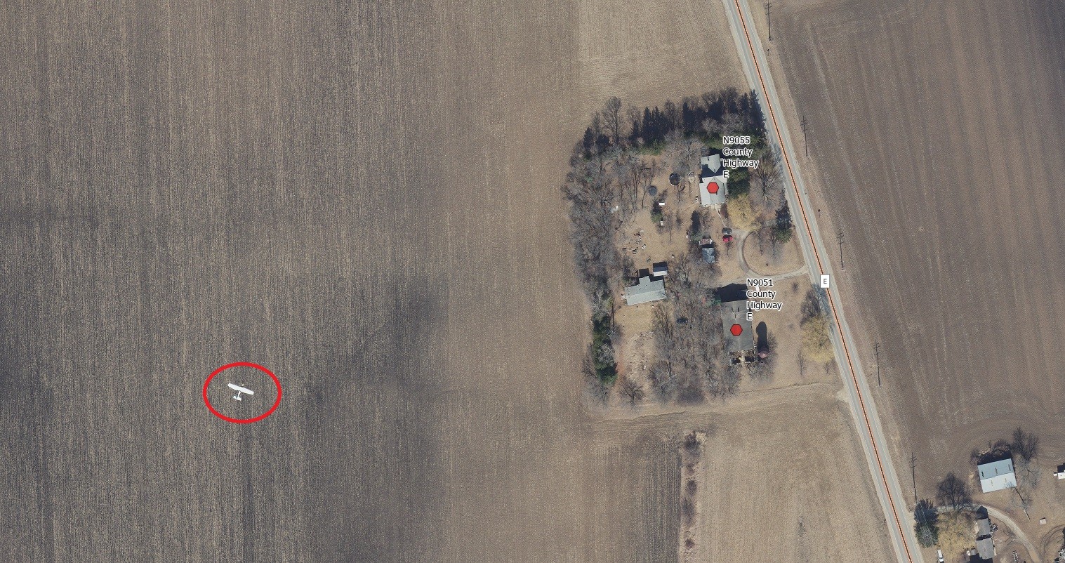 Wait, is that a giant red shoe out in the middle of a field? A bit hard to see from the air, but if you check out Google Maps and submitted photos you can see a shoe with an unclear lineage. Some have suggested this was once part of a now-defunct Wisconsin Dells roadside attraction called the Emerald City Castle. Submitted by Kelly Felton, Sauk County. Photo date: 2015.